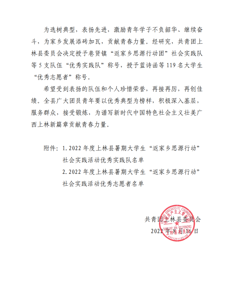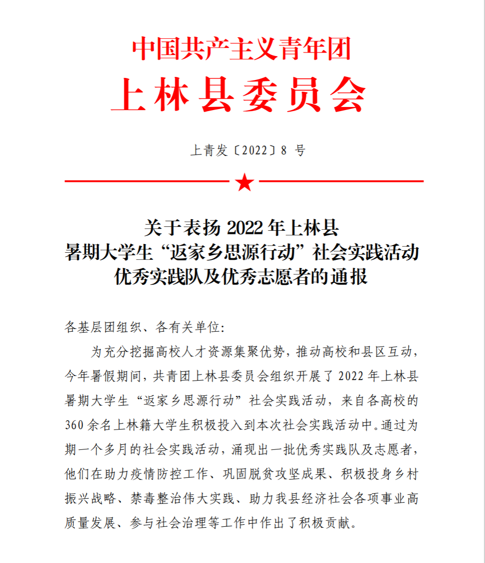 近日,我院收到上林县团委的表扬信,表扬我院2021级高分子材料与工程专业的韦秋乐同学在2022年上林县暑期大学生“返家乡思源行动”社会实践活动中,助力疫情防控、参与社会治理等工作中作出了积极贡献。