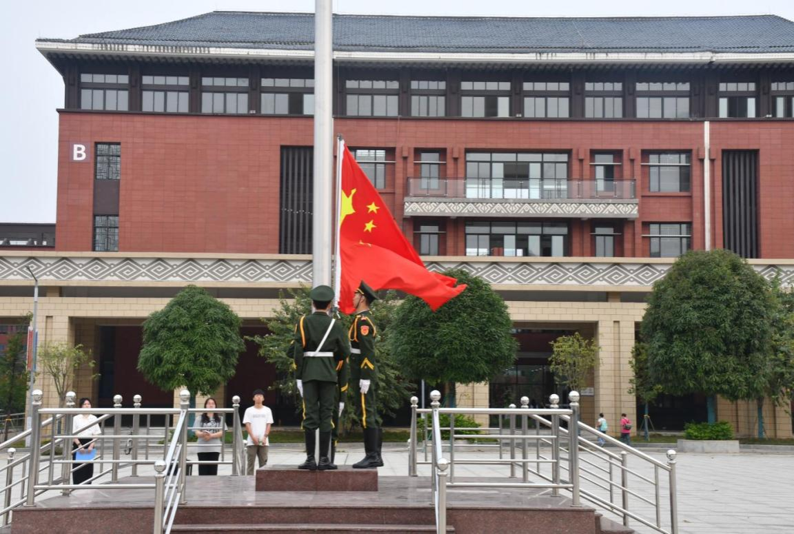 随着雄壮的国歌声响起,五星红旗缓缓升起,迎风飘扬。全体师生肃立,向国旗行注目礼。