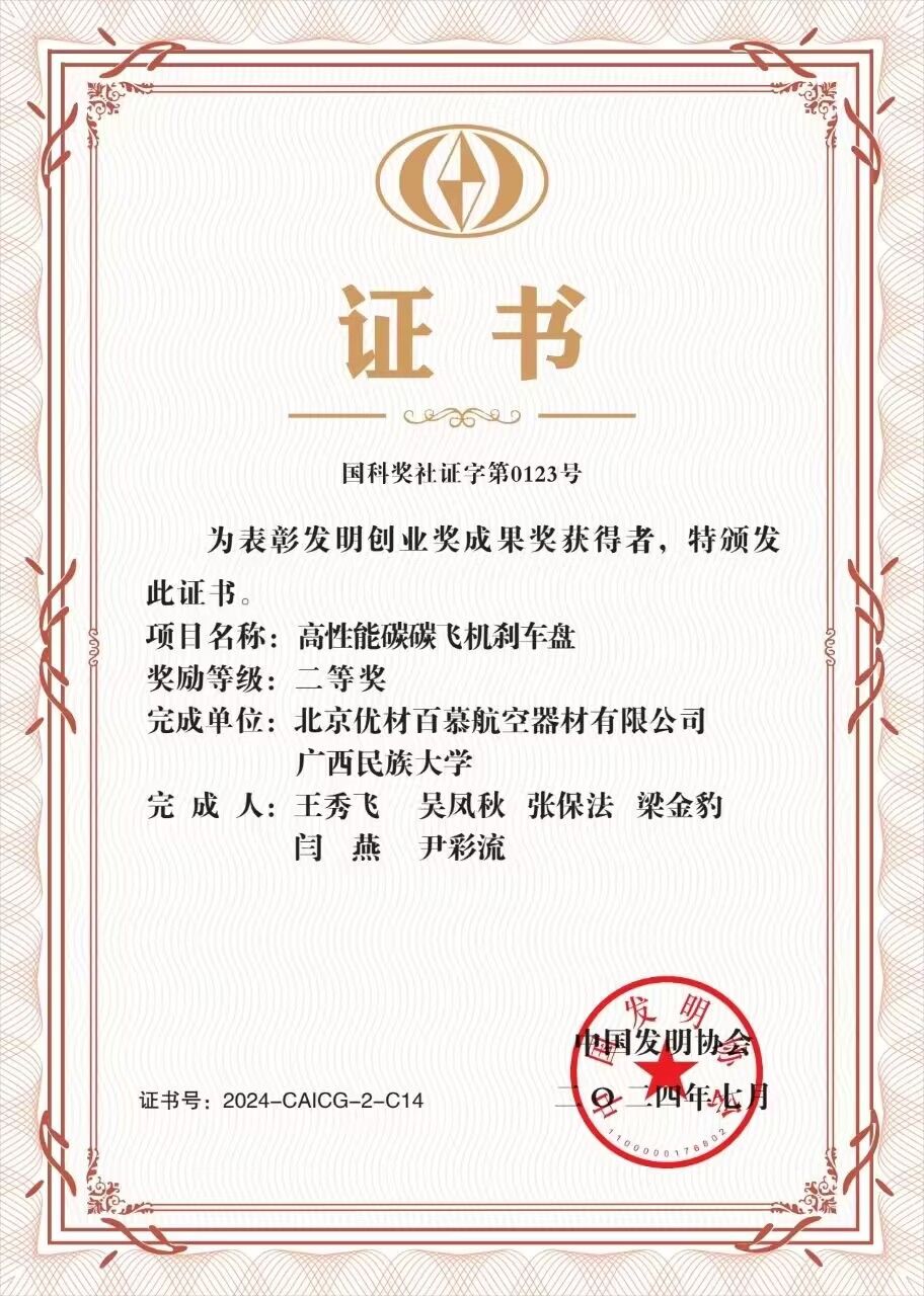 近日,2024年度发明创业奖名单正式发布,我院尹彩流研究员参与的项目“高性能碳碳飞机刹车盘”荣获中国发明协会创业奖成果奖二等奖。该奖项是由国家科技部批准,中国发明协会设立的国家级奖项,旨在促进产学研深度融合,推动发明创新事业高质量发展。