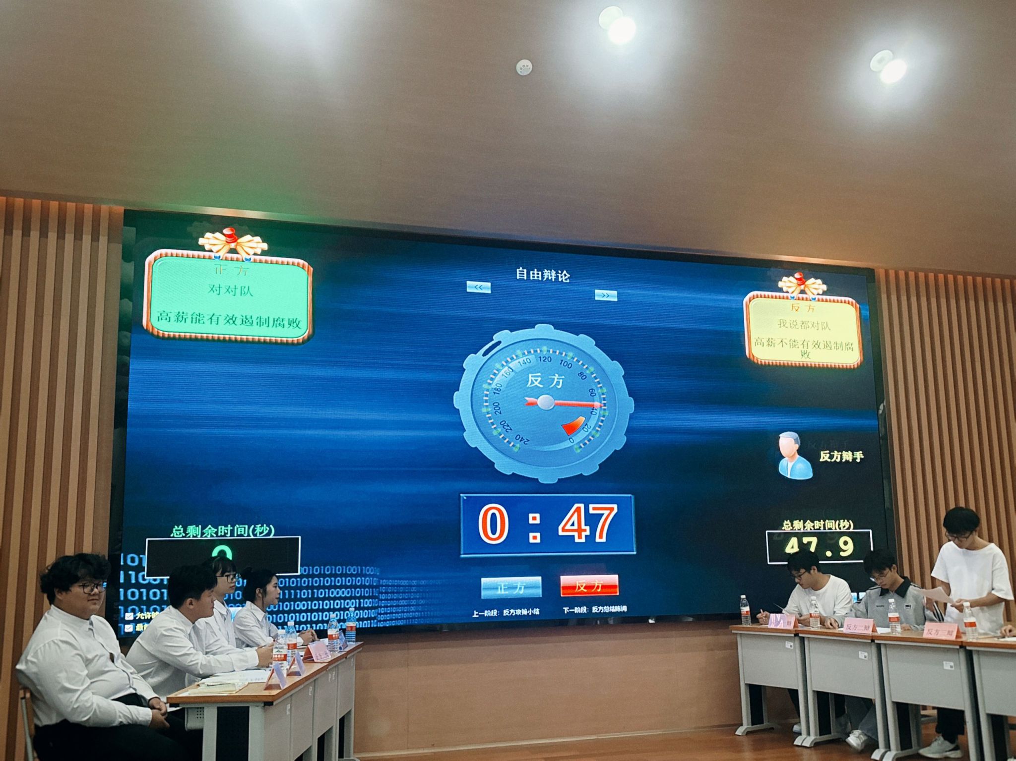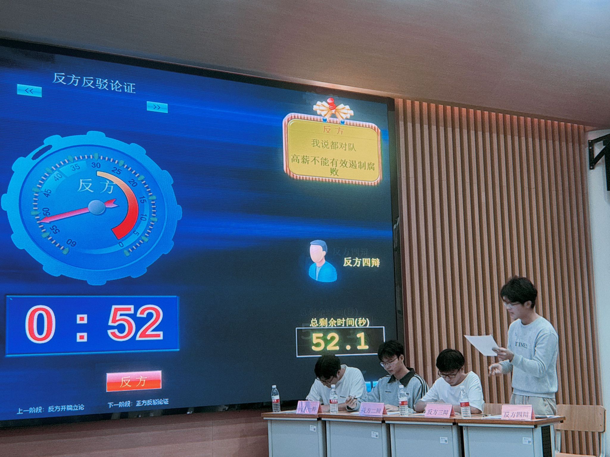 比赛一开始,双方辩手便迅速进入状态。正方首先抛出立论,从“有效遏制”破题,提出高薪作为一种激励手段,能够“有效”地“遏制”腐败现象的发生,并且能够提升从业者的职业满足感和社会地位,进而促使从业者更加珍惜自己的职业,从而有效遏制腐败现象的发生。正方辩手们通过严密的逻辑推理和生动的实例,为自己的观点奠定了坚实的基础。面对正方的立论,反方辩手并未退缩,而是针锋相对地提出了质疑。他们认为,提出高薪并非遏制腐败的根本手段,腐败的根源在于制度漏洞、权力寻租以及道德沦丧等多方面因素。