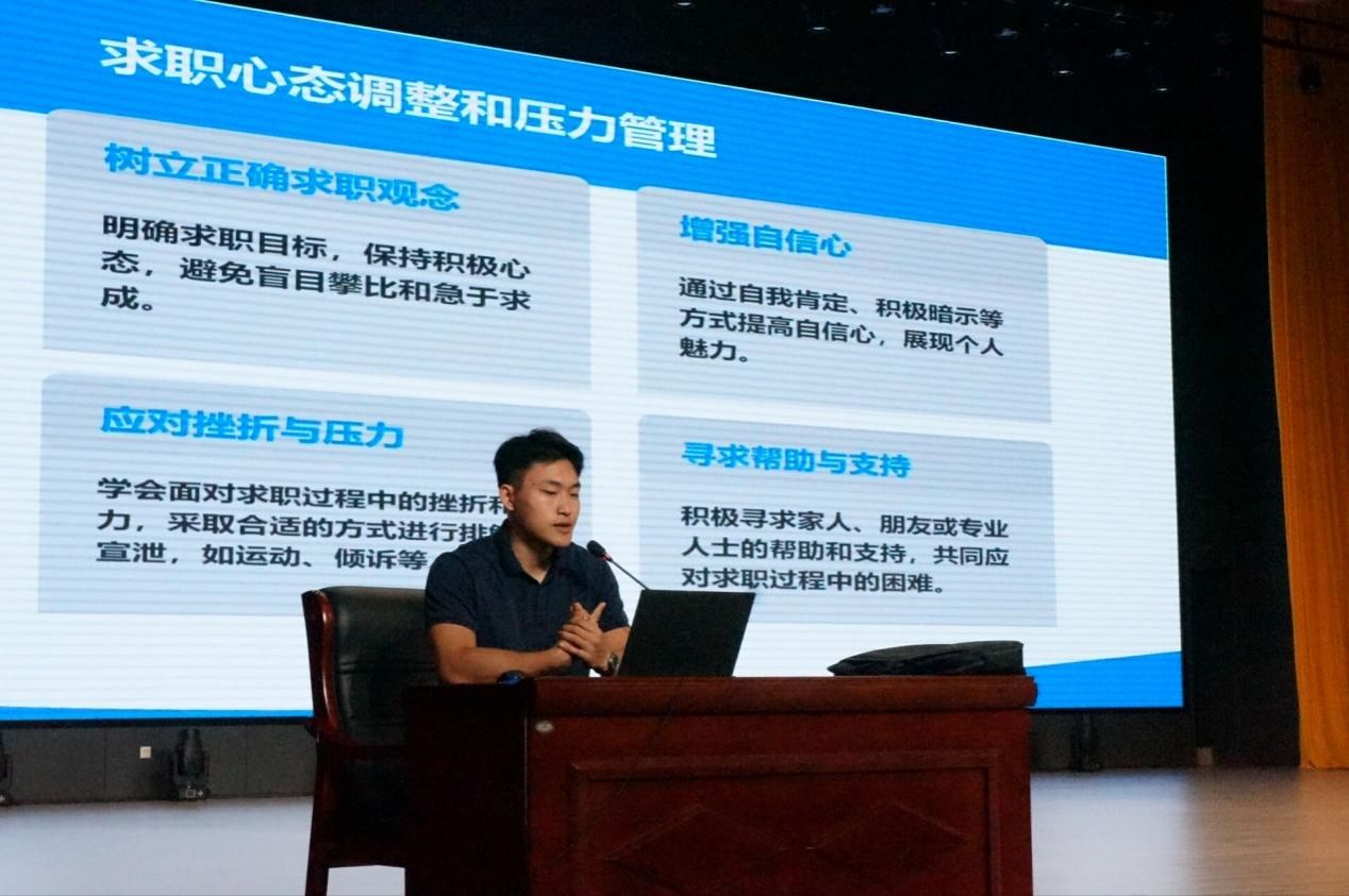 9月21日下午,我院专职辅导员玄濮睿老师结合当前就业形势,强调职业生涯规划的重要性,通过展示我院近3年来的就业数据与毕业生去向,分析用人单位需求,引导新生明确职业兴趣、发挥自身优势,树立科学的职业观与发展观。