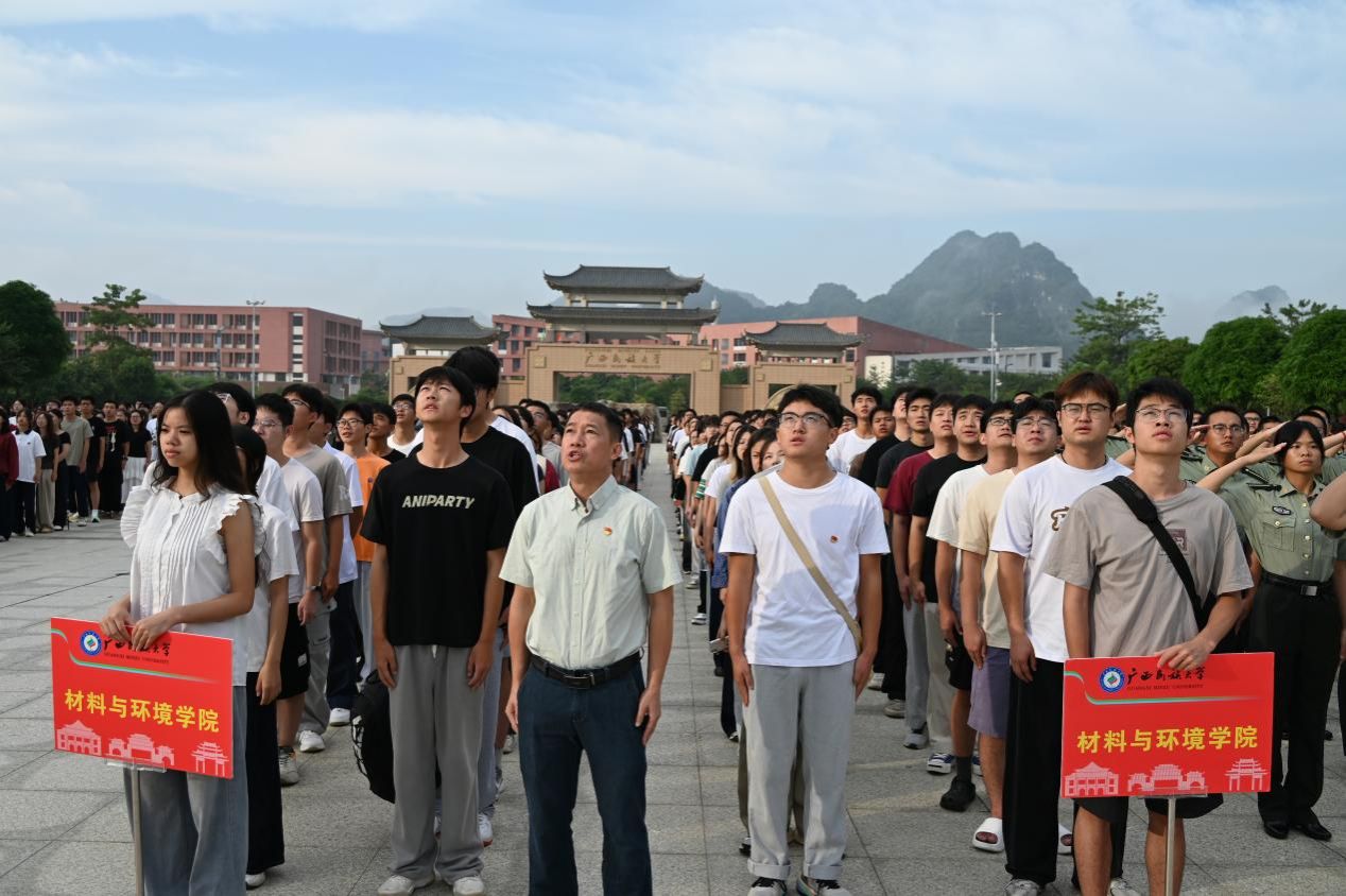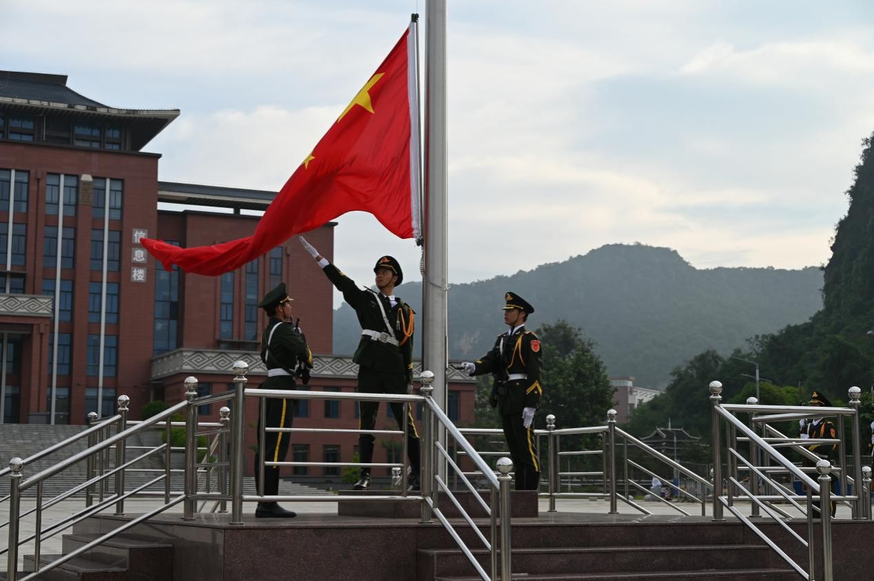 为庆祝中华人民共和国成立七十六周年,传承红色文化基因,10月1日上午,广西民族大学在相思湖校区、思源湖校区和武鸣校区同步举行升旗仪式。我院党委书记黄寒及在校师生在武鸣校区厚德广场参加升旗仪式。