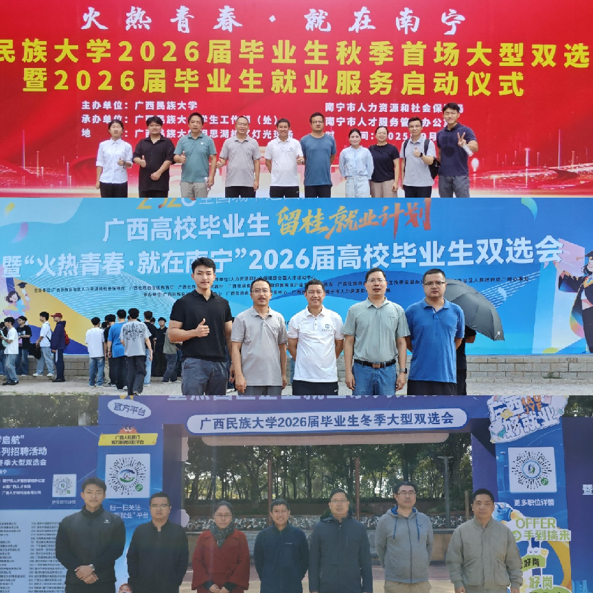 在“走出去”的同时,学院积极实施“企业进校园”计划,先后邀请巴德富集团、广东乐居商贸集团和中国核工业二三建设有限公司等多家优质企业到校宣讲,累计开展线上线下各类宣讲会及招聘活动19场。组织毕业生参与学校大型双选会13场,联合兄弟学院在武鸣校区开展联合招聘会1场。企业代表走进校园,与毕业生面对面交流行业发展情况、企业文化和岗位需求,显著提升了人岗匹配精准度与签约质量。