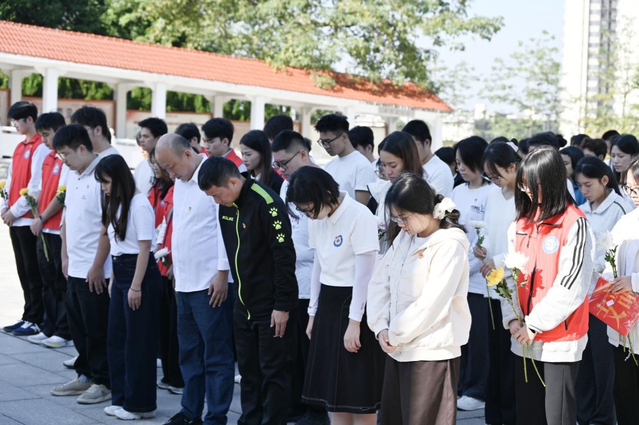 缅怀先烈寄哀思,初心如磐向未来。上午10时,公祭广场烈士纪念碑前庄严肃穆,全体师生整齐列队,举行庄重的缅怀仪式。大家肃立默哀,向革命烈士深深三鞠躬,随后缓缓敬献鲜花,一朵朵洁白和黄色的鲜花承载着对先烈的深切缅怀与崇高敬意,静静诉说着后辈对英雄的追思与传承。