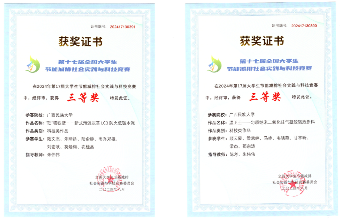 2024年8月4日至7日,第十七届全国大学生节能减排社会实践与科技竞赛决赛在中国石油大学(华东)举行。由我院陆文杰、朱际娇、陆俞静、韦乔郑雄、刘宏耿、莫烩梅、农桂晶组成的“砼墙铁壁”代表队和顾云霞、侯慧婷、马峥、韦晓燕、甘宇昕、梁杰、邵宗涛组成的“温卫士”代表队均斩获全国三等奖。全国大学生节能减排社会实践与科技竞赛紧密围绕国家能源与环境政策,紧密对接国家和区域重大发展需求,经过数十年的发展,现已成为全国高校影响力最大的科创竞赛之一。赛事旨在增强大学生节能环保意识、科技创新意识和团队协作精神,提升大学生的创新设计能力、工程实践能力和社会调查能力。
