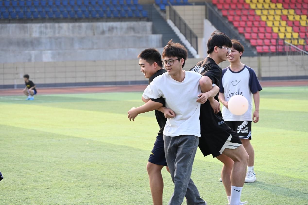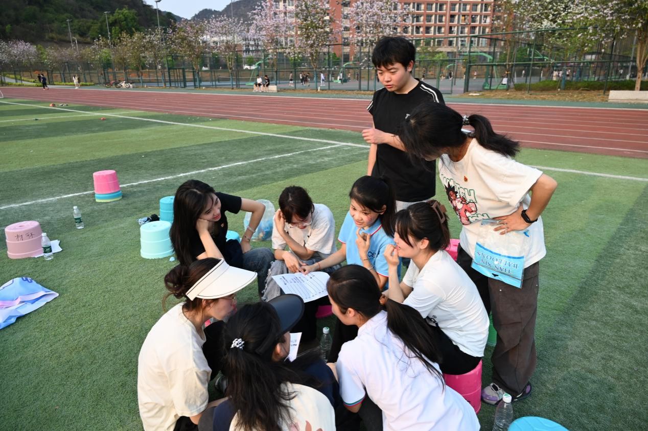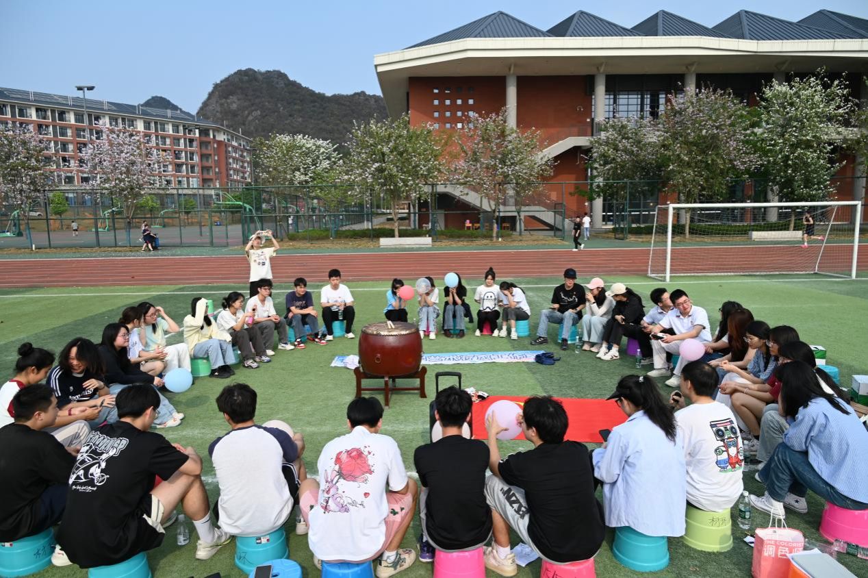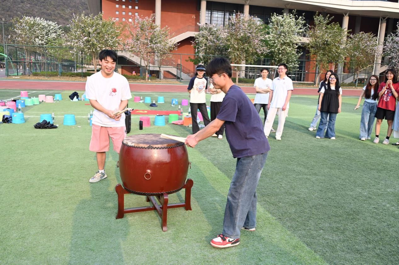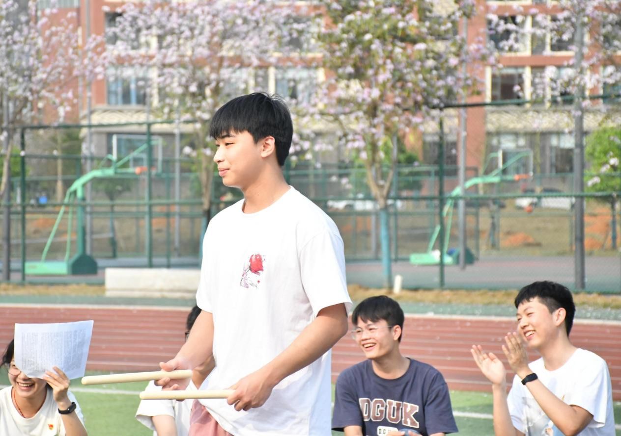 理论学习后,随着“击鼓传花”的节奏响起,春日操场化身欢乐海洋。在“大风吹”的趣味指令中,两院学子在欢声笑语中拉近了距离。接下来的素质拓展游戏将活动推向高潮。“红歌猜猜猜”重温经典旋律,以音符强化红色记忆;“背夹气球跑”用协作诠释信任力量;“蒙眼击鼓”结合正念冥想指导,通过呼吸调节提升党员的专注力,通过声音指引培养沟通技巧;“你画我猜”则运用投射心理学原理,从肢体语言洞察思维模式。活动全程配备心理观察员,记录学生互动中的情绪变化与协作效能。活动持续近三小时,学生党员通过多元互动有效缓解了学业压力。我院学生党员廖文游表示:“游戏设计融合党建元素,这种寓教于乐的方式让理论学习更入脑入心。”