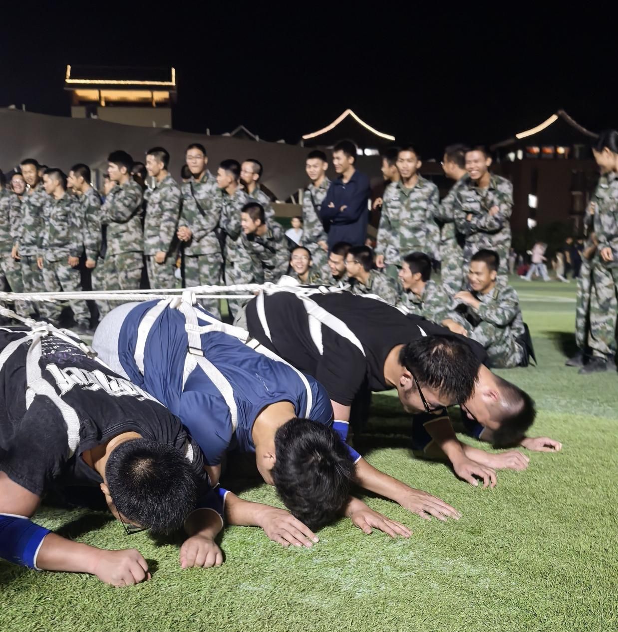 团体项目训练现场同样热火朝天。“大象拔河”项目中,队员们与人民武装学院的同学们展开实战演练,紧握绳索、协同发力,展现出坚韧不拔的拼搏精神;“协同大转盘”项目中,队员们围绕“快速转动、稳定衔接、零失误配合”的目标反复练习,专注每一个技术细节;“长绳”项目中,队员们从生疏到流畅,每一次起落都见证着团队的进步与成长。