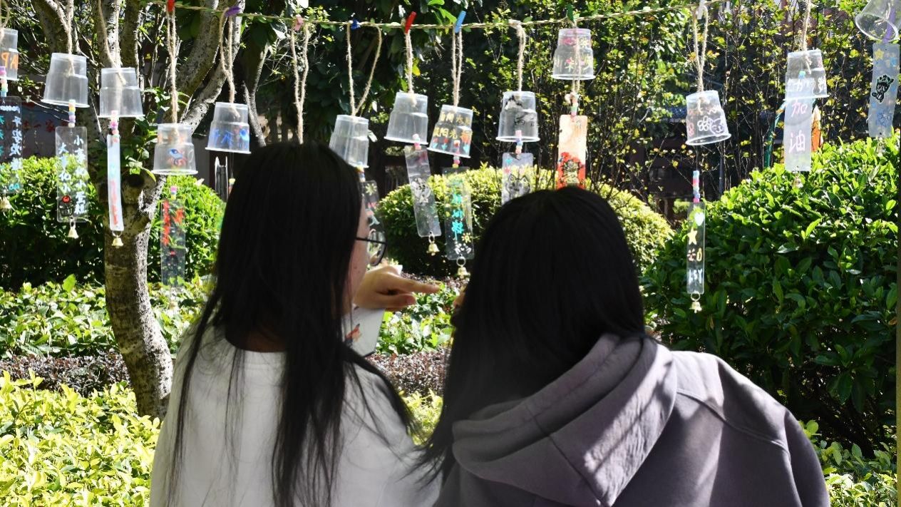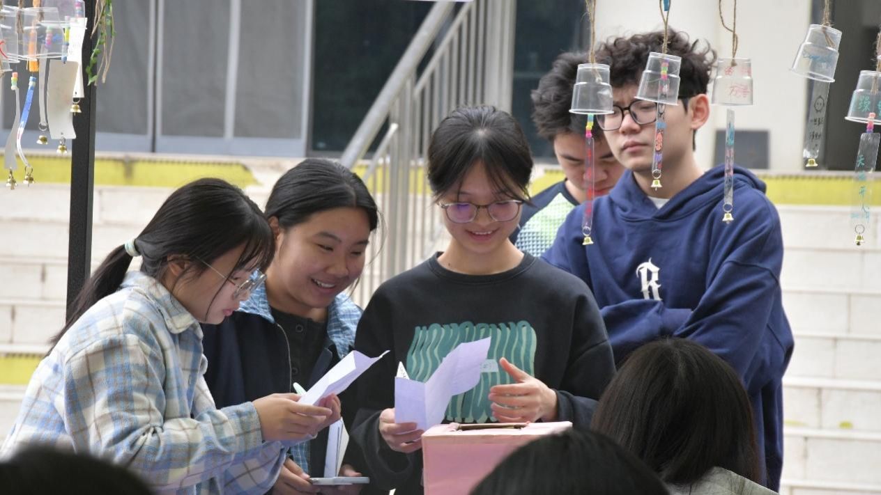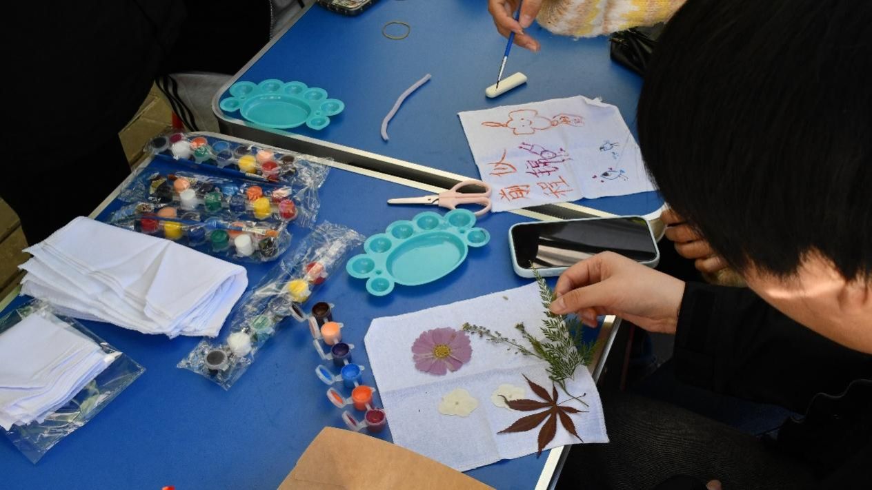 展示区则汇集了同学们的情感表达。风铃上悬挂着手写祝福,装饰布上点缀着姓名与爱心图案,干花书签封存着自然气息——每一件作品都是一段心情的记录,吸引众人驻足欣赏。