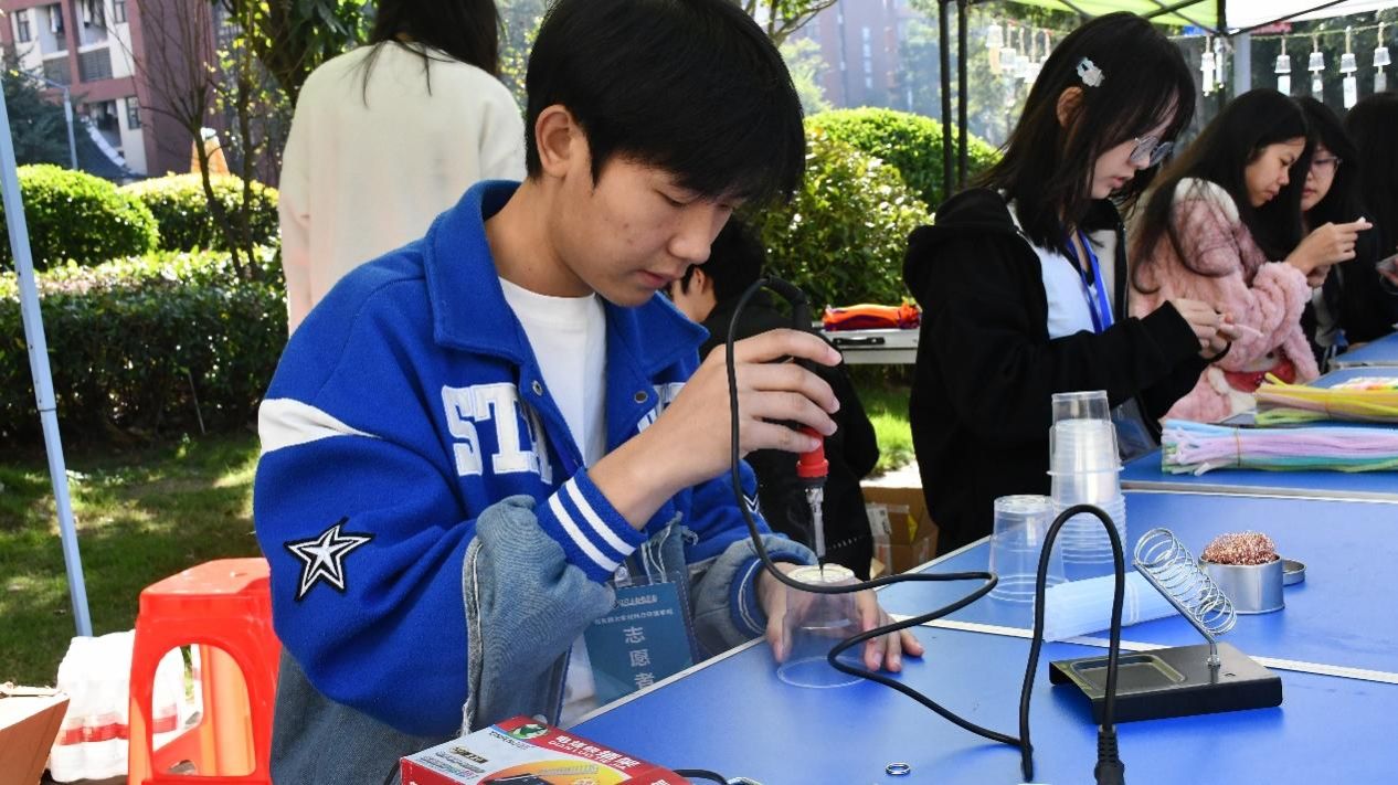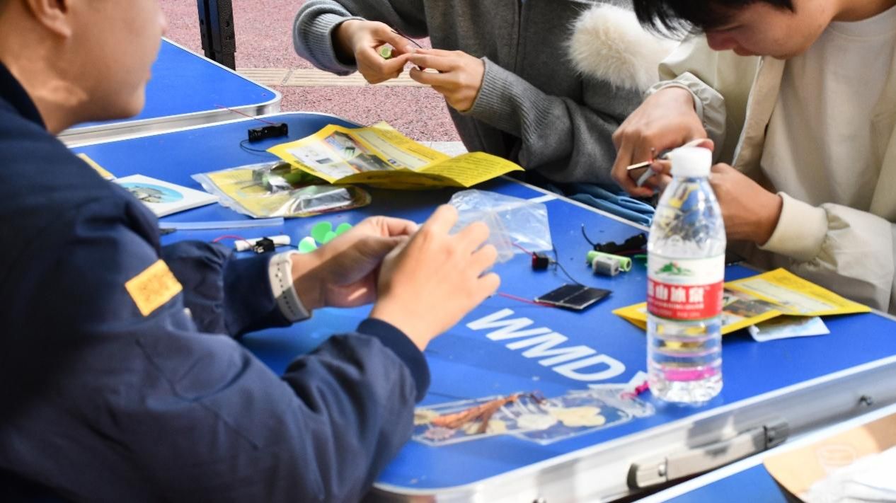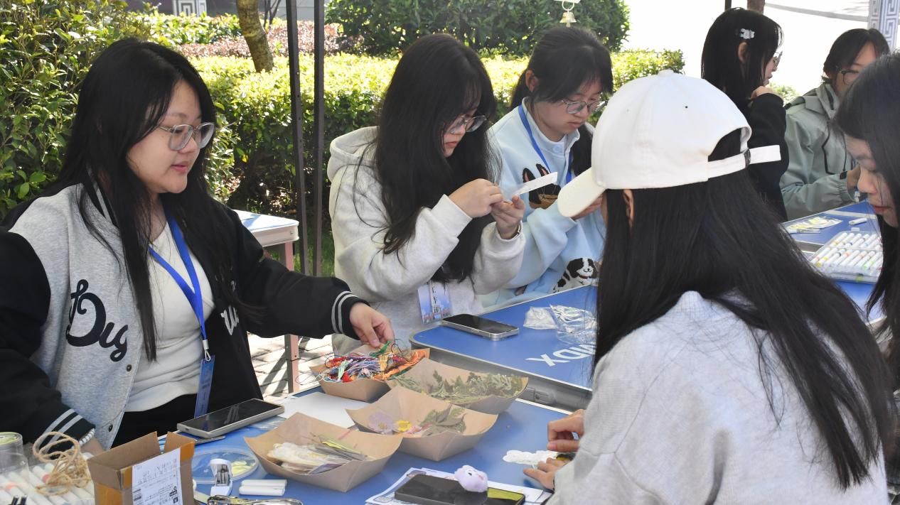 手工区成为践行学院专业理念的创意实践空间。同学们在工作人员的引导下,动手改造废弃塑料杯、扭扭棒、干花等常见物料进行创意改造,精心制作出独具特色的风铃、小风扇、装饰布与干花书签。从塑形、拼贴到最终完成,每一步都专注而治愈,让平凡物料在环保创意中焕发新生,生动诠释了“变废为宝”的环境友好理念。