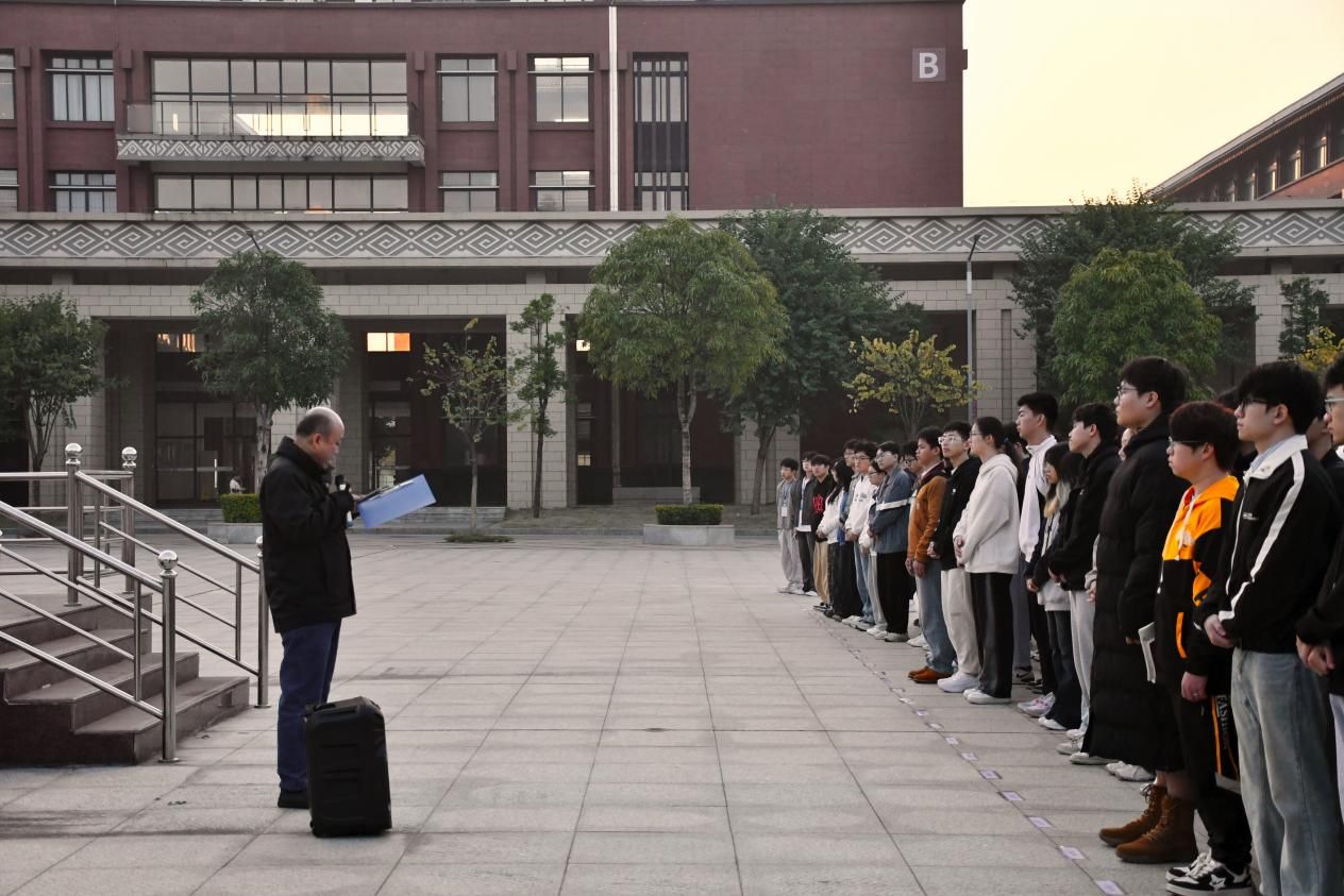 雷炳新副院长作国旗下讲话。他围绕“心向阳光,筑梦青春”的主题,鼓励同学们将心灵关怀转化为逐梦动力,保持积极心态,在奋斗中绽放青春光彩。同时,他强调维护心理健康是每个人的责任,倡导师生从自我关怀做起,通过互帮互助,共同营造温暖、向上的成长氛围。