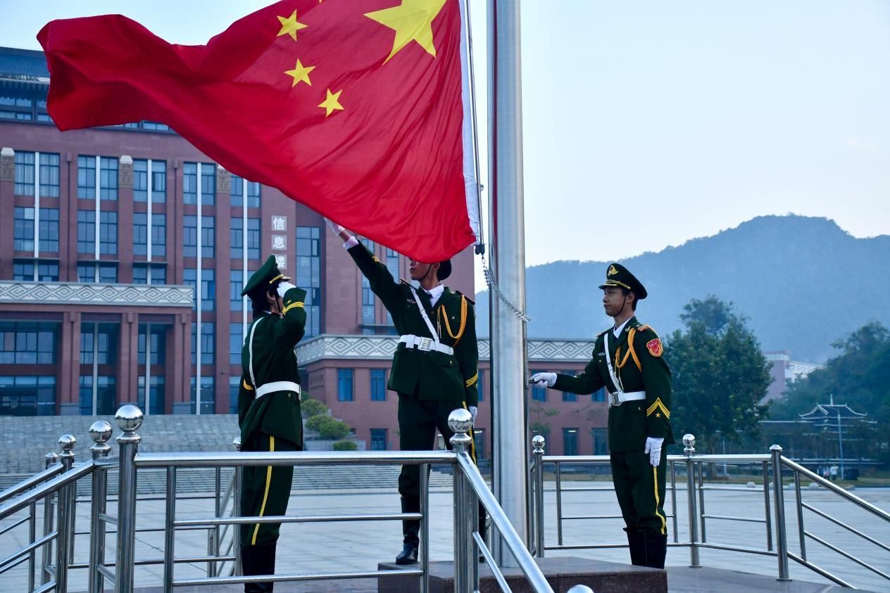 伴随着雄壮的《义勇军进行曲》,五星红旗冉冉升起,全体师生肃立行注目礼,高唱国歌,深切表达对祖国的敬意与热爱。